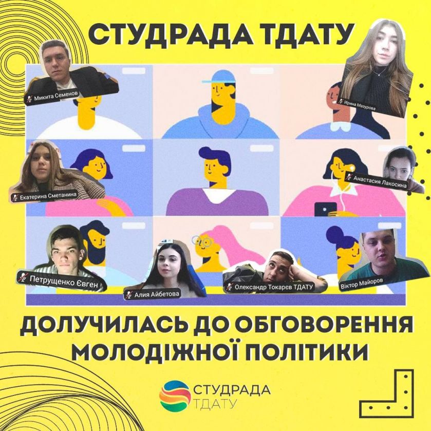 Студрада Таврійського державного агротехнологічного університету імені Дмитра Моторного долучилась на онлайн обговорення міських програм: «Реалізація молодіжної політики та підтримка обдарованої молоді» та «Національно-патріотичне виховання молоді».