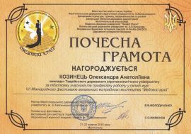 У VІІ Міжнародному фестивалі-конкурсі «Медовий край» брали участь, як вокалісти за профілем, так і вокалісти інших спеціальностей. Таврійський державний агротехнологічний університет на фестивалі представляла студентка факультету агротехнологій та екології Катерина Колесніченко, яка була відзначена дипломом учасника фестивалю.