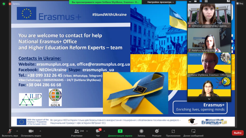 Нещодавно представники Відділу міжнародних зв’язків взяли участь у International Contact Webinar: Supporting Ukraine in Higher Education, який був організований Національним Еразмус+ офісом в Україні спільно з Міністерством освіти та науки України, European Association for International Education, German-Ukrainian Academic Society, Leibniz University Hannover та Erasmus Student Network Ukraine у співпраці з Представництвом Європейського Союзу в Україні та Національними Еразмус+ Агентствами країн-членів Програми.