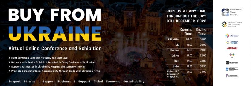 International Trade Council у співпраці з СМС-Ukraine та Українським Кластерним Альянсом 8 грудня провели віртуальну В2В конференцію-виставку BUY FROM UKRAINE. У рамках ініціативи можливо було отримати живе спілкування з різними колами посадовців і представників бізнесу; переглянути віртуальні стенди та виставковий простір; запропонувати власні товари і послуги.
