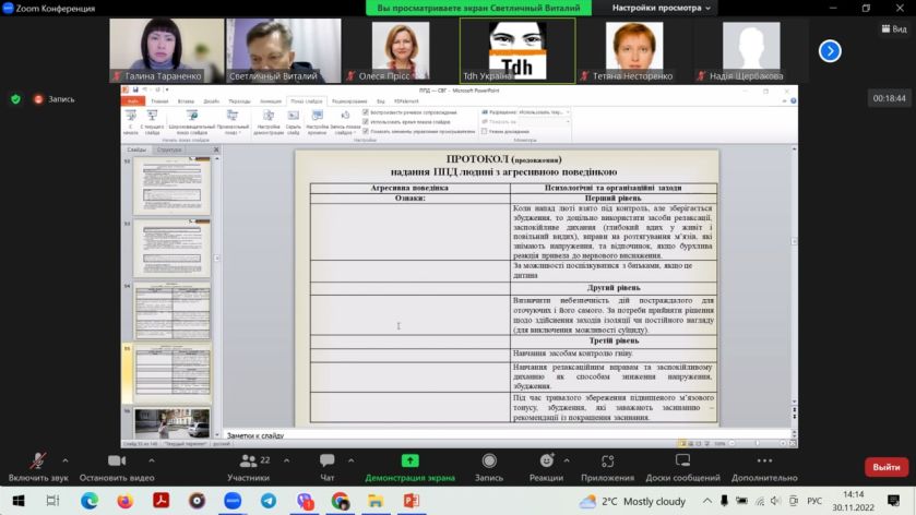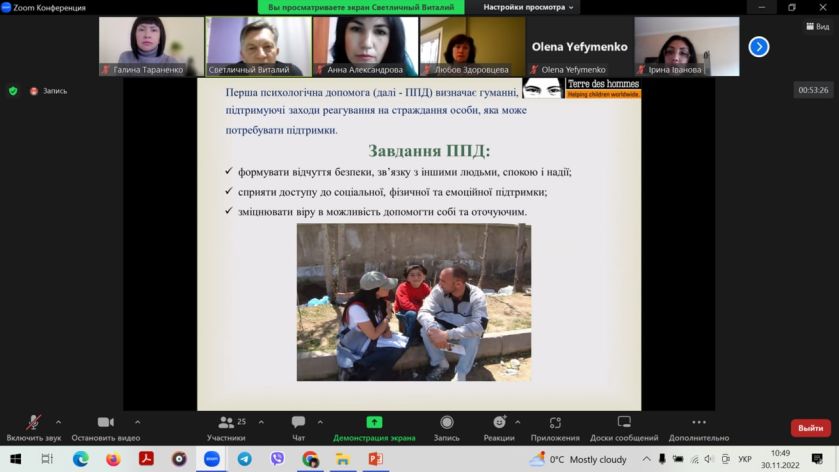 30 листопада 2022 року відбувся онлайн-тренінг «Перша психологічна допомога в умовах надзвичайної ситуації», який проводиться в рамках проєкту “Підтримка економічної участі вразливих груп населення, включно з внутрішньо переміщеними особами, в Україні”, який виконує німецька федеральна компанія Deutsche Gesellschaft für Internationale Zusammenarbeit (GIZ) GmbH за дорученням уряду Німеччини.