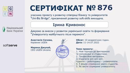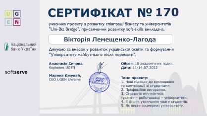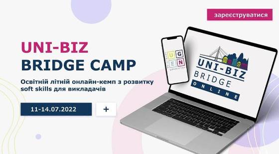 “Uni-Biz Bridge Camp” – це освітній літній онлайн-кемп з розвитку soft skills для викладачів. З 11 по 14 липня 2022 року викладачі кафедри «Іноземні мови» Вікторія Лемещенко-Лагода та Ірина Кривонос були учасниками онлайн конференцій, де виступали представники бізнесу, тренер Національного банку України, амбасадор з фінансової грамотності на тему soft skills та було організовано World-cafe на тему “Університет майбутнього після перемоги”.