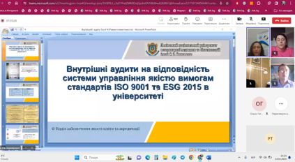 - внутрішніми аудитами на відповідність системи управління якістю вимогам стандартів ISO 9001 та ESG 2015 в університеті;
