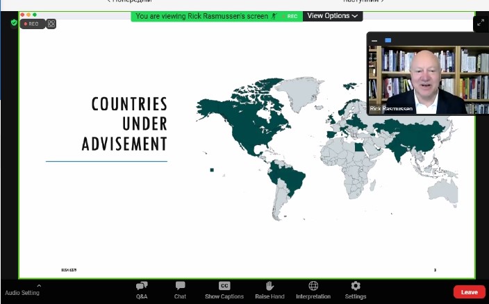 Рік Расмуссен у вступному слові подякував проєкту Ukraine Global Faculty за надану можливість спілкування з українською аудиторією, стисло розповів про себе і також представив свого колегу Домініка Піоте.
