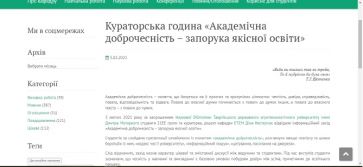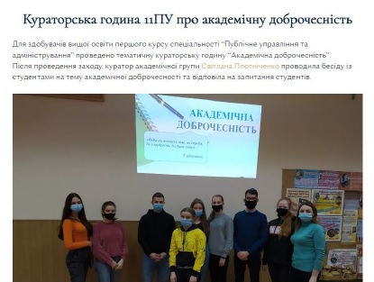 Академічна доброчесність є невід’ємною складовою освітнього процесу, а дотримання її принципів під час навчання в університеті впливає не лише на якість освіти, а й на формування цінностей випускників та їх уявлення про світ, соціум, успіх, працю. Пізнавальними для студентів були кураторські години за темою «Академічна доброчесність». Фахівці бібліотеки на інформаційних заходах знайомлять студентів із засадами академічної доброчесності, її цінностями, розглядають інструменти дотримання академічної чесності у нашому закладі освіти, які викладені у Статуті ТДАТУ, Кодексі честі Університету, Антикорупційній програмі ТДАТУ.