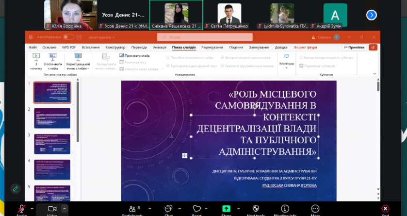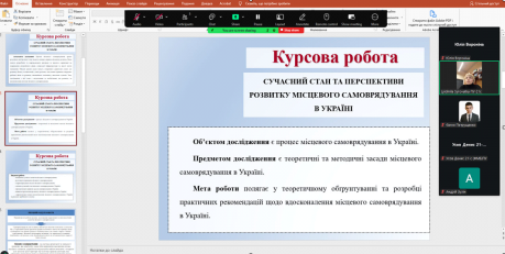 Під час презентацій курсових робіт здобувачі продемонстрували ґрунтовні аналітичні дослідження, уміння працювати з нормативно-правовою базою та застосовувати сучасні управлінські інструменти у сфері публічної політики й державного управління. Доповіді були логічно структуровані, аргументовані та містили практичні висновки.