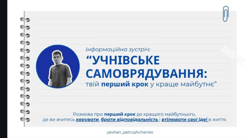 На початку жовтня Євген провів інформаційну зустріч зі старшокласниками Середнянського ліцею, що на Закарпатті. Під час заходу Євген розповів учням про важливість лідерства та відповідальності, наголосивши на тому, що учнівське самоврядування – це не просто формальність, а реальна можливість впливати на своє оточення і змінювати шкільне життя на краще. Він поділився власним досвідом у студентському самоврядуванні під час окупації Мелітополя та онлайн-навчання, надихаючи учнів діяти активно незалежно від обставин.