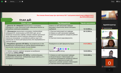 Наприкінці заходу завідувачка відділу довела до слухачів План дій щодо моніторингу та перегляду освітніх програм у 2024-2025 навч. році з необхідними для цього підтверджуючими документами та термінами виконання.