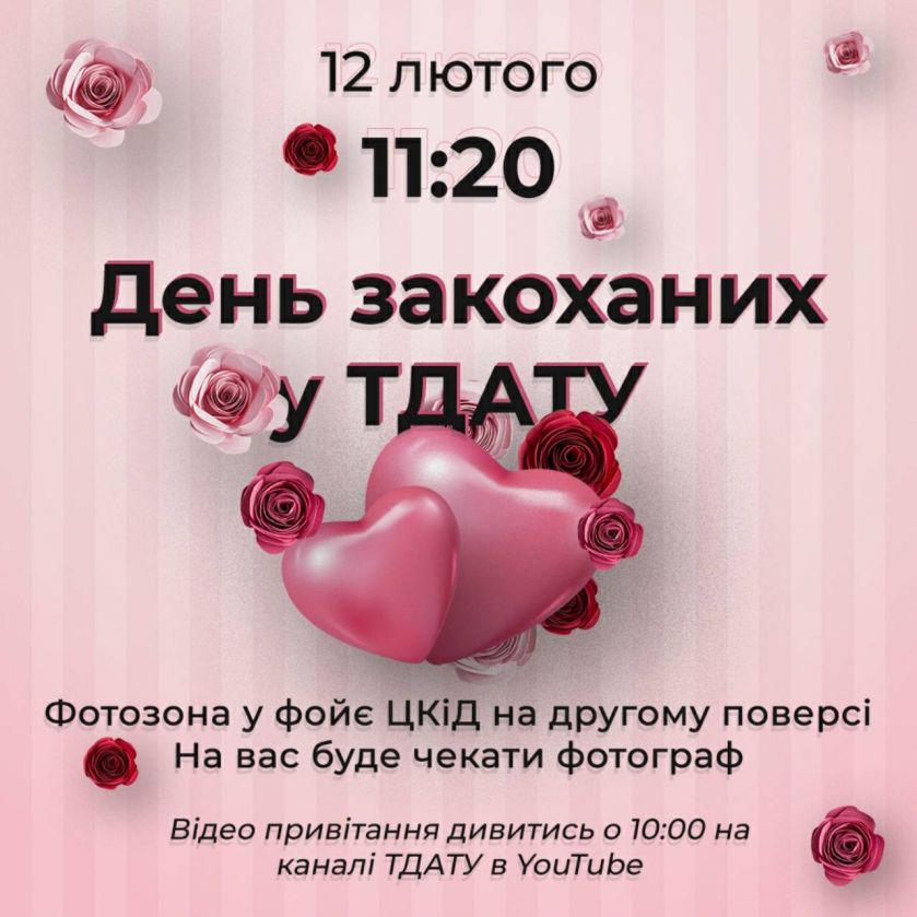 12 лютого, рівно о 10:00 на YouTube-каналі «ТГАТУ-ТДАТУ Мелітополь» на вас чекає відеопривітання від креативної команди ЦКІД, а об 11:20 на другому поверсі Центру культури і дозвілля, всі бажаючі зможуть зробити фото на пам’ять. Біля святкової фото зони на Вас чекатиме фотограф.