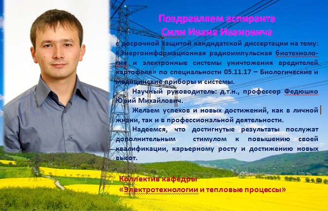 Вітаємо із захистом дисертації! 30.11.2015 Кафедра електротехнологій і теплових процесів щиро вітає аспіранта Сілі Івана Івановича із достроковим захистом кандидатської дисертації!