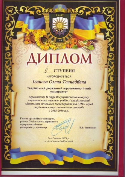 У запеклій боротьбі ІІ місце в конкурсі виборола здобувач ступеня вищої освіти “Магістр” спеціальності “Підприємництво, торгівля та біржова діяльність” – Іванова Олена (група 11 МБ ПТ). Керівник – доктора економічних наук, професора Яворської Тетяни Іванівни, Олена підготувала змістовну, практично орієнтовану наукову роботу про перспективи відродження тваринництва в регіоні.
