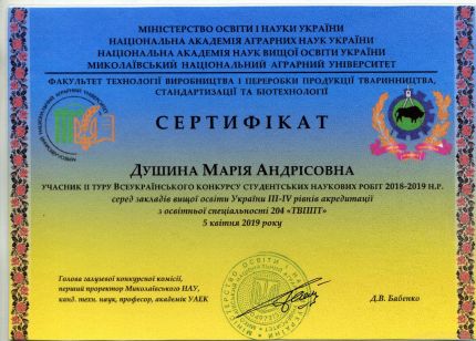 Марія під керівництвом професора кафедри харчових технологій та готельно-ресторанної справи Данченко Олени Олександрівни, представила наукову роботу за темою «Застосування екстракту вівса посівного в годівлі птиці як технологічний засіб підвищення якості м’ясної продукції». Захист проекту проходив у МНАУ в форматі підсумкової науково-практичної конференції.