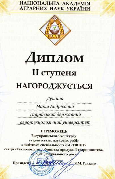За перемогу в конкурсі Душина М. отримала диплом ІІ ступеня Національної академії наук.