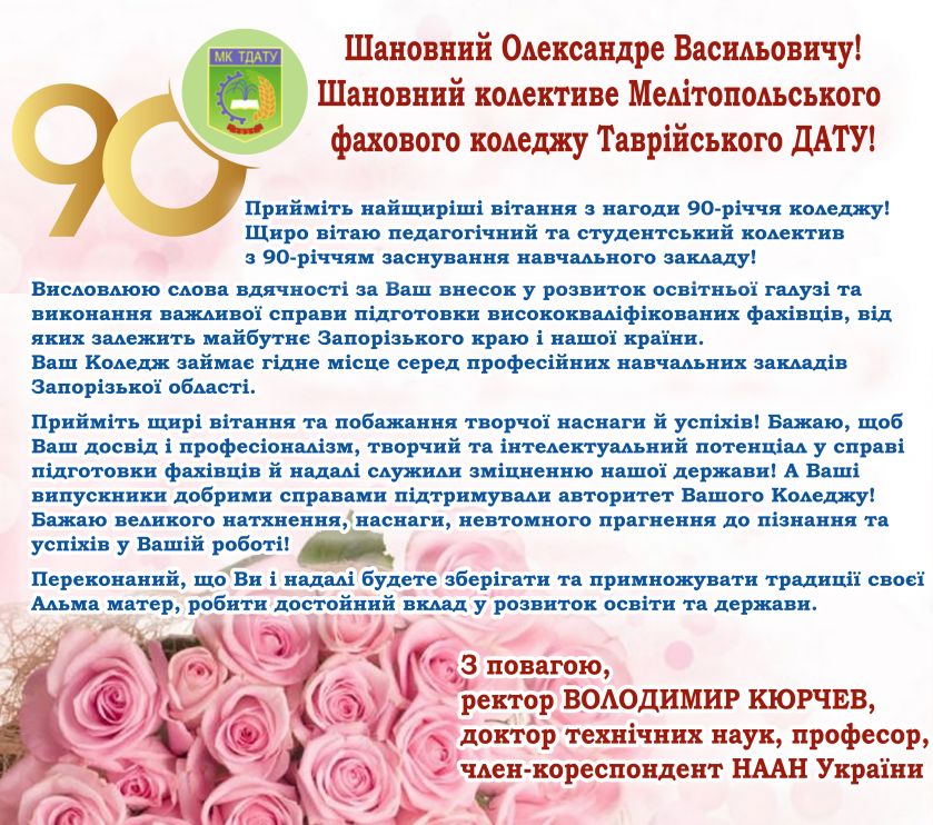 Вітаємо Мелітопольський фаховий коледж ТДАТУ з 90-річчям