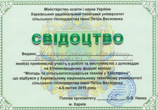 З доповіддю від Таврійського державного агротехнологічного університету виступив Нестеровський М.В. (15 МБ АІ, керівник: доц. каф. ТСС АПК Паніна В.В.) на тему: «Вибір способу відновлення грунтообробних робочих органів по багатокритеріальній оцінці відстані до цілі», та прийняв дистанційну участь Бублік А.Д. (16 МБ АІ, керівник: проф. каф. ТСС АПК Журавель Д.П.) на тему: «Обгрунтування методу та розробка обладнання для контролю зносу пар тертя». За результатами доповідей тези увійшли у електронний збірник форуму.