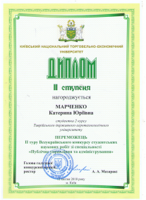 Марченко Катерина (факультет економіки та бізнесу; науковий керівник к.е.н., ст. викладач Осипенко С.О.; спеціальність «Публічне управління та адміністрування») – диплом II ступеня