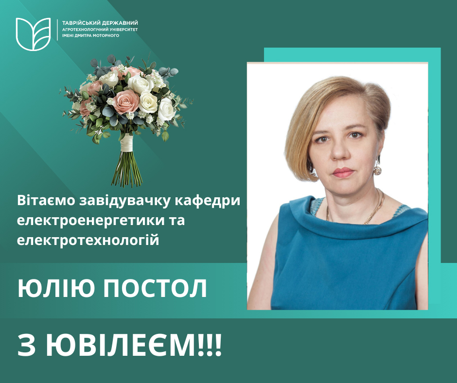 Вітаємо завідувачку кафедри електроенергетики та електротехнологій Юлію Постол з ювілеєм