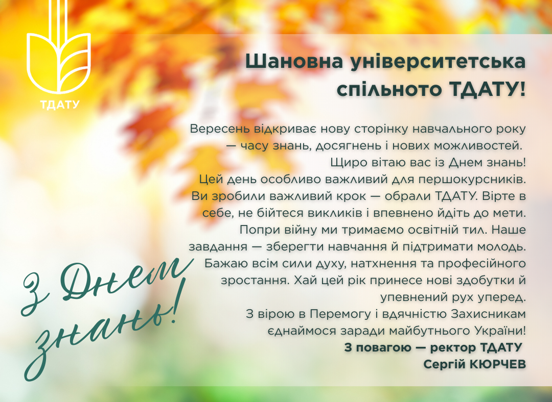 Вітання ректора ТДАТУ з Днем знань