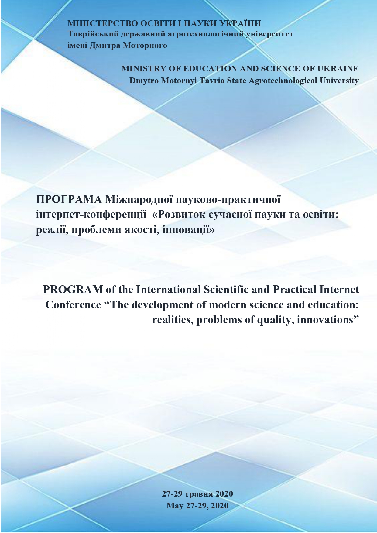 27-29 травня 2020 року у Таврійському державному агротехнологічному університеті імені Дмитра Моторного на базі кафедри «Вища математика і фізика» пройшла Міжнародна науково-практична інтернет-конференція «РОЗВИТОК СУЧАСНОЇ НАУКИ ТА ОСВІТИ: РЕАЛІЇ, ПРОБЛЕМИ ЯКОСТІ, ІННОВАЦІЇ».