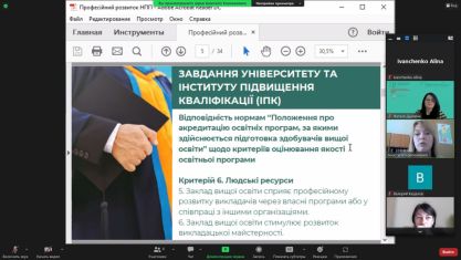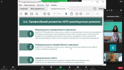 Цей захід було прсвячено питанню щодо системи професійного розвитку викладачів у нашому університеті. Анастасія Коноваленко ознайомила викладачів кафедри з існуючими підходами до професійного розвитку викладачів та діючим Положення про професійний розвиток НПП, особливостями організації підвищення кваліфікації.
