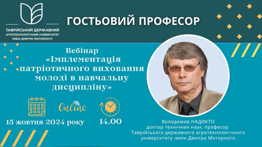 15 жовтня 2024 року в межах академічного руху «Гостьовий професор» Вищої школи педагогічної майстерності у ТДАТУ відбулася відкрита лекція «Імплементація патріотичного виховання молоді в навчальну дисципліну», в якій прйняли участь викладачі кафедри. Спікером заходу був доктор технічних наук, професор кафедри експлуатації та технічного сервісу машин ТДАТУ, член-кореспондент НААН України Володимир Надиктор.