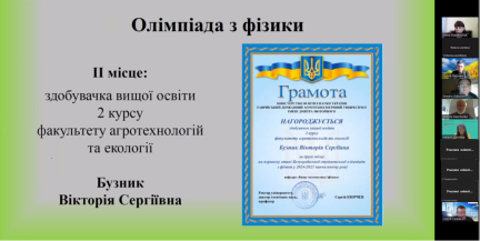 Свої привітання та оголошення учасників олімпіад, які посіли треті місця висловила доцент кафедри вищої математики і фізики Таврійського державного агротехнологічного університету імені Дмитра Моторного, кандидат технічних наук, відповідальна на кафедрі за наукову роботу і роботу зі студентами Альона Дяденчук. Вона акцентувала увагу всіх на тому, що своєю енергією здобувачі освіти допомагають викладачам крокувати вперед. А призерам побажала, щоб їх перемога стала стимулом до подальших досягнень!