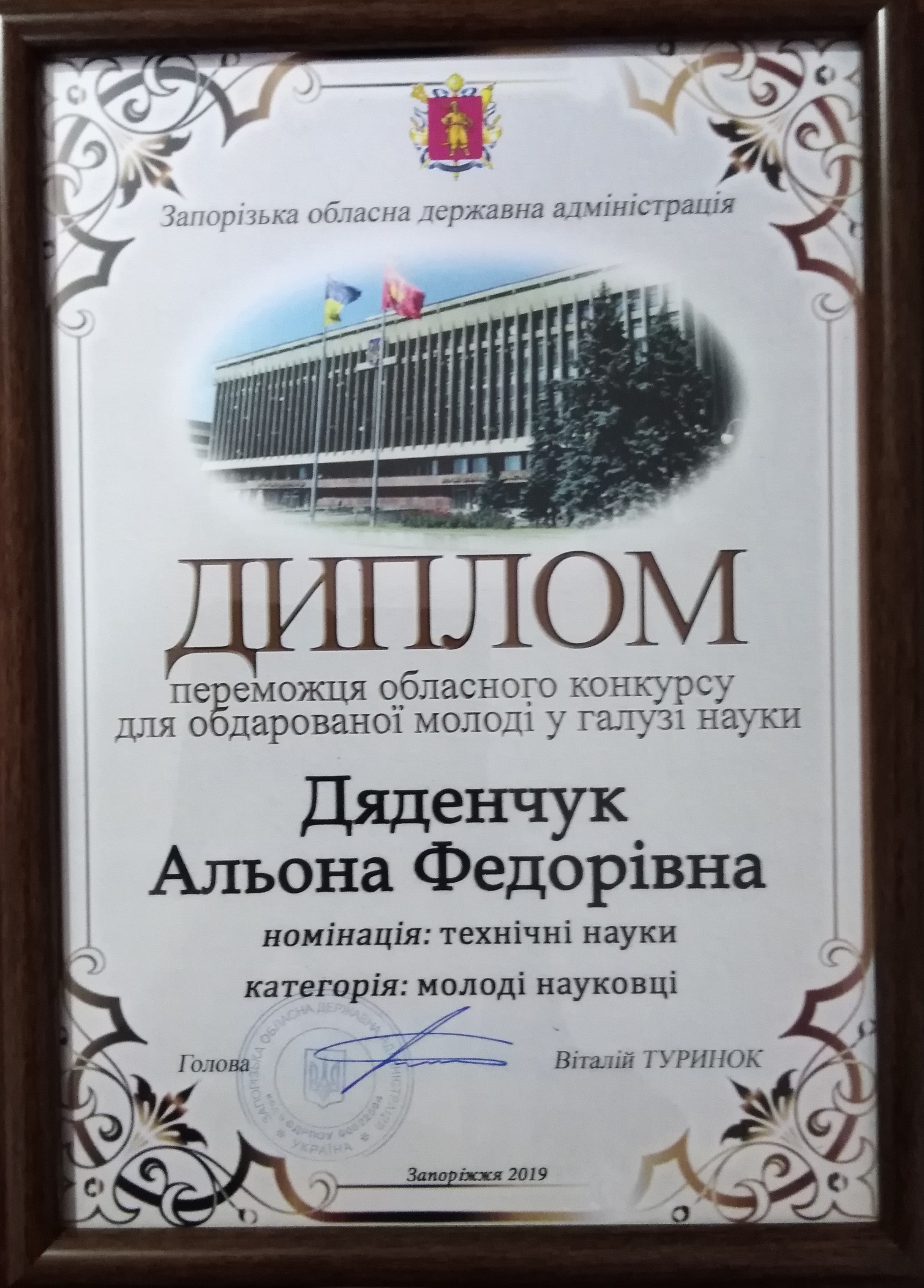 12 листопада 2019 року в Запорізькій обласній державній адміністрації відбулася урочиста церемонія нагородження переможців щорічного обласного конкурсу для обдарованої молоді в галузі науки. Організатором інтелектуального змагання стали співробітники Управління молоді, фізичної культури та спорту ЗОДА. У 2019 році на розсуд конкурсної комісії було подано 130 робіт за різними напрямами з усіх вищих навчальних закладів Запорізької області та з підприємств та установ міста.