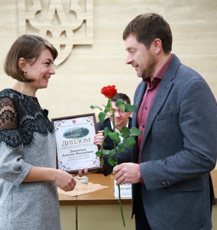 Серед нагороджених переможців була і старший викладач кафедри вищої математики і фізики ТДАТУ Дяденчук Альона Федорівна. Її наукова робота «Фізико-технологічні засади отримання гетероструктури ZnO/Si з поруватим буферним шаром для приладів оптоелектроніки» визнана кращою серед молодих науковців у номінації «Технічні науки».