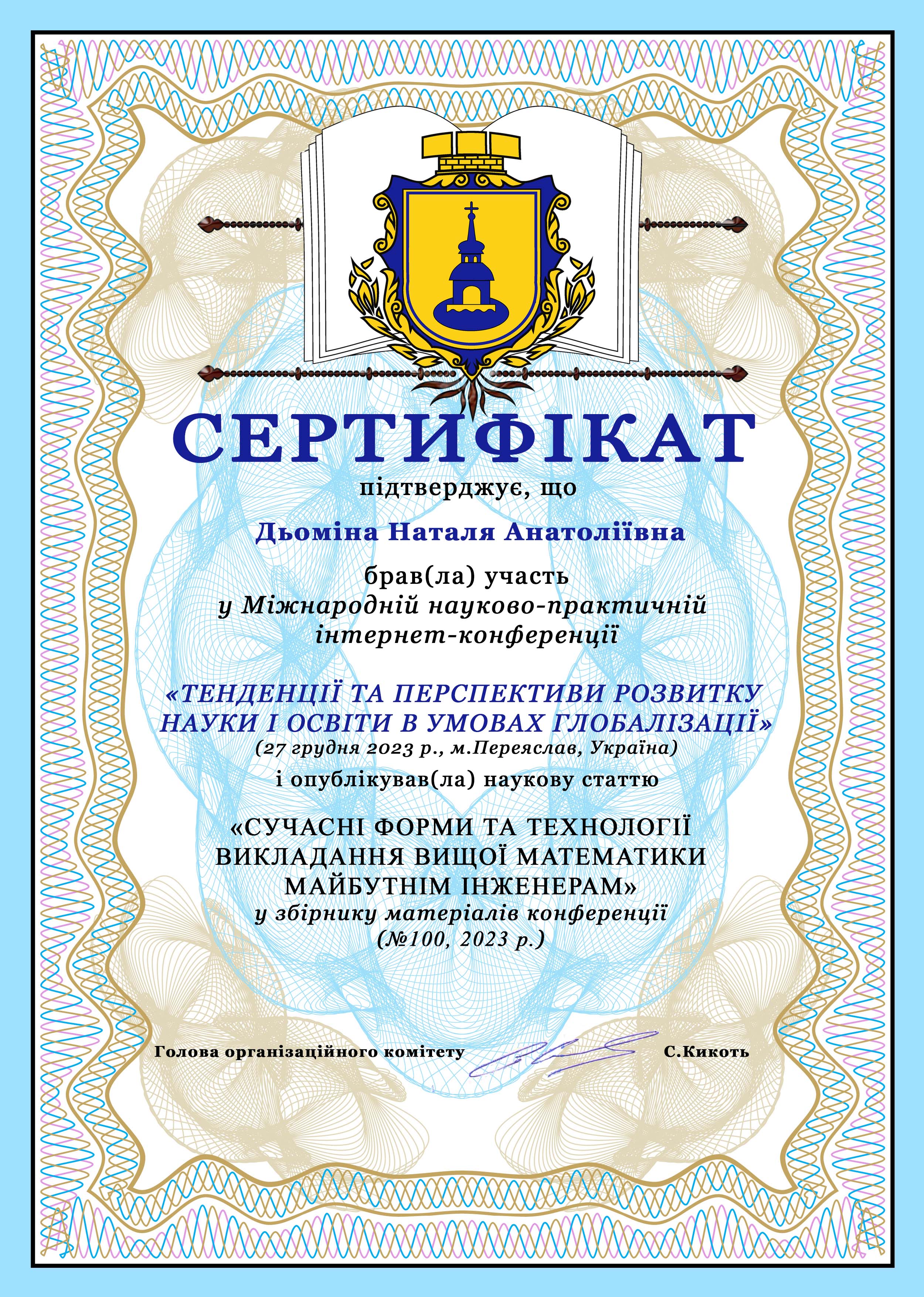 27 грудня 2023 року на базі Университету Григория Сковороды в Переяславе відбулася Міжнародна науково-практична інтернет-конференція «ТЕНДЕНЦІЇ ТА ПЕРСПЕКТИВИ РОЗВИТКУ НАУКИ І ОСВІТИ В УМОВАХ ГЛОБАЛІЗАЦІЇ», в якій прийняли участь доцент кафедри, к.т.н. Наталя Дьоміна