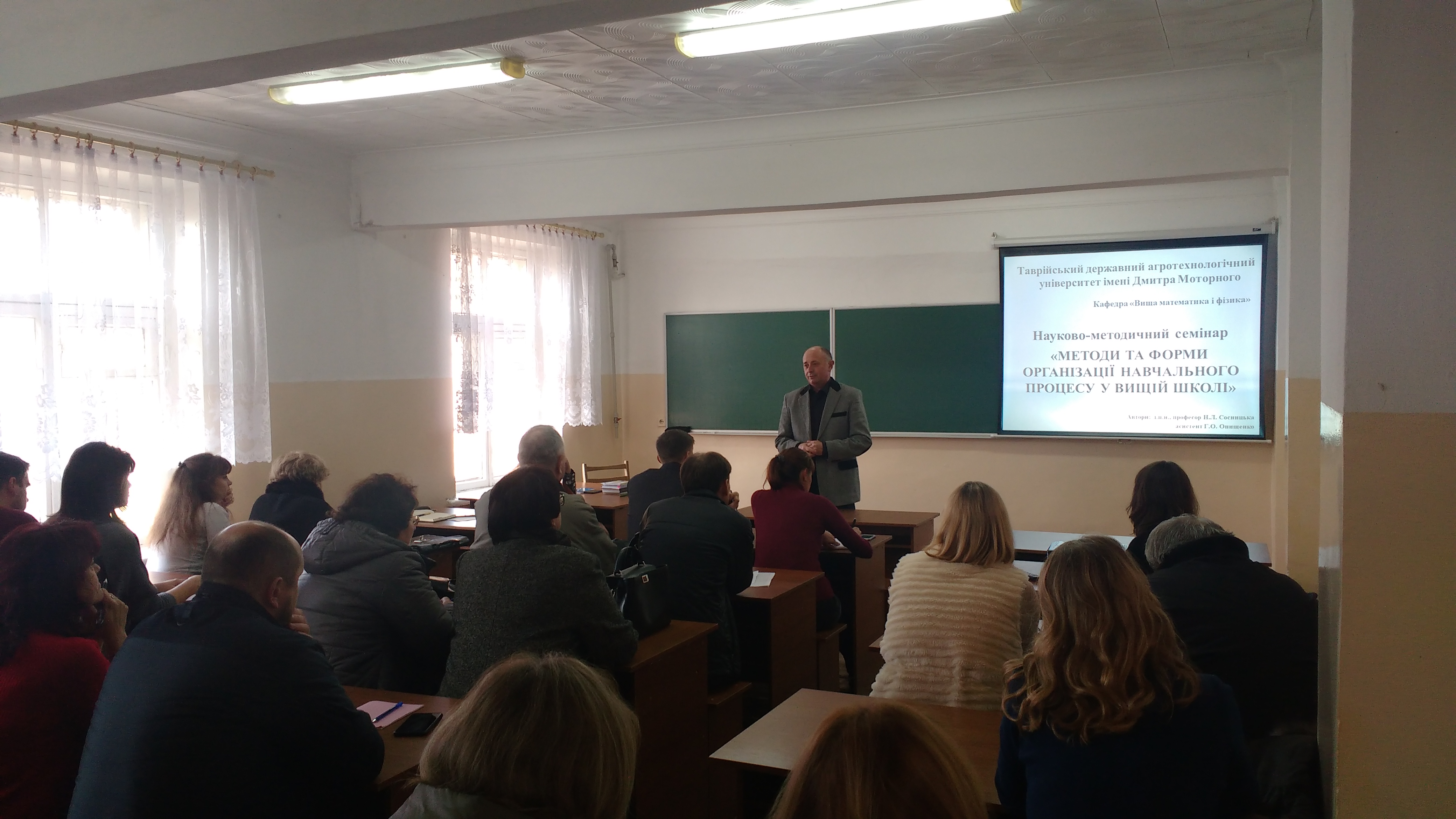 1 листопада 2019 року, згідно плану роботи Вищої школи педагогічної майстерності, на базі кафедри вищої математики і фізики Таврійського державного агротехнологічного університету імені Дмитра Моторного було проведено науково-медодичний семінар «Методи та форми організації навчального процесу у вищій школі», який був присвячений саме цим питанням. З вітальним словом до учасників семінару звернувся перший проректор, кандидат технічних наук, професор Олександр Скляр. У процесі роботи семінару виступила з доповідю д.п.н., професор, завідувач кафедри вищої математики і фізики Наталя Сосницька. Вона презентувала і детально розповіла про методи і форми навчання. На всі запитання, що виникали у присутніх, Наталя Сосницька надала вичерпні відповіді. Учасники обмінялися враженнями, коментарями та висловили подяку доповідачу.