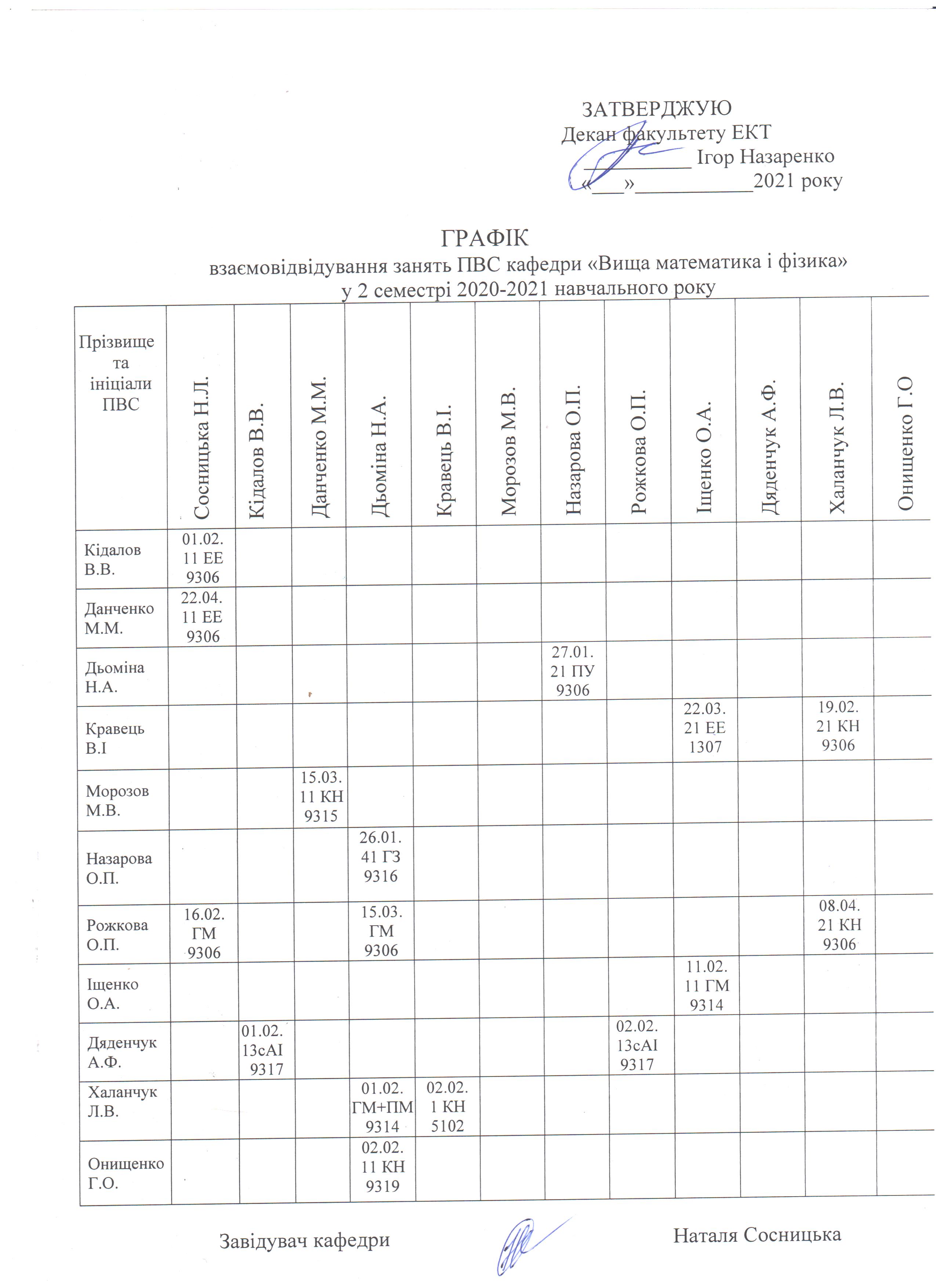 Взаємовідвідування занять на кафедрі – це відвідування викладачами інших викладачів кафедри не менш одного заняття за семестр. Вони проводяться за наступним графіком: