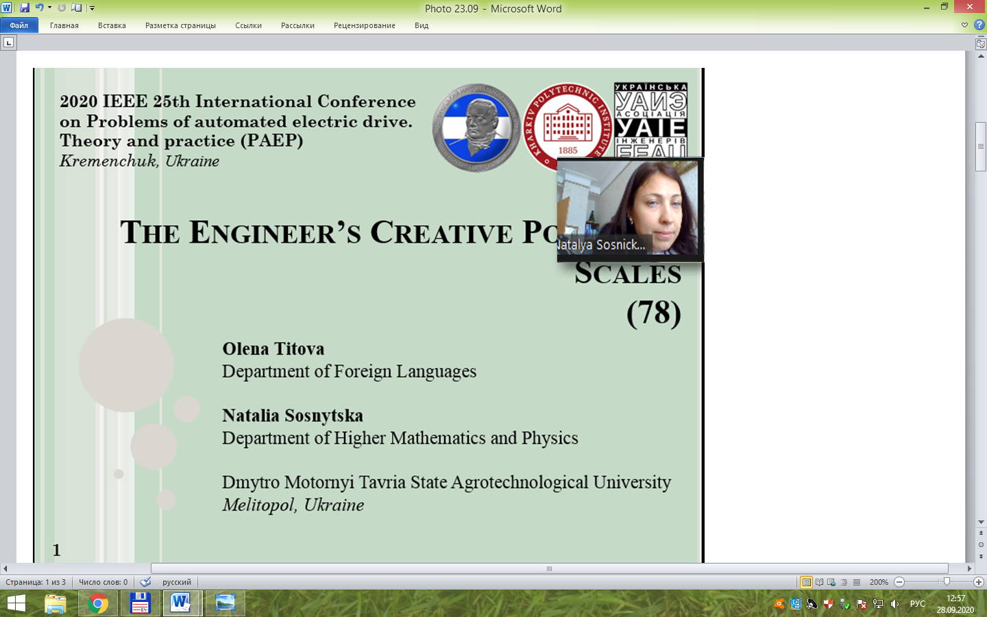 Teachers of Higher Mathematics and Physics Department, Doctor of Pedagogical Sciences, Professor, Head of the Department Natalia Sosnytska, Ph.D., Associate Professor Mykola Morozov, Assistant Professor Larysa Khalanchuk as well as Candidate of Pedagogical Sciences, Associate Professor, Vice-Rector for International Affairs Olena Titova represented our university at 2020 IEEE 25th International Conference on Problems of automated electric drive. Theory and practice (PAEP). The conference took place at Mykhailo Ostrogradsky Kremenchug National University on September 21st-25th, 2020.