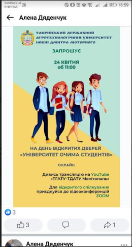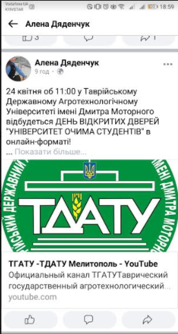 Не припиняється профорієнтаційна робота у Таврійському державному агротехнологічному університеті імені Дмитра Моторного. Викладачі кафедри «Вища математика і фізика» взяли активну участь у проведенні Дня відкритих дверей для випускників шкіл Запорізької області в режимі он-лайн 24 квітня 2021 року. Актуальну інформацію про проведення Дня відкритих дверей у ТДАТУ було розміщено протягом квітня 2021 року на сторінках викладачів кафедри у мережах Facebook та Інстаграм і в додатоку-месенджері Viber. Взяти участь у Дні відкритих дверей було запрошено учнів шкіл Оріхівського району – гімназії № 1 «Сузір’я» (м. Оріхів), Малотокмачанської ЗОШ, комунального закладу «Навчально-виховний комплекс «Джерело» Комишуваської селищної ради та комунального закладу «Новотавричеська загальноосвітня школа І-ІІІ ступенів Комишуваської селищної ради, їх батьків та вчителів.