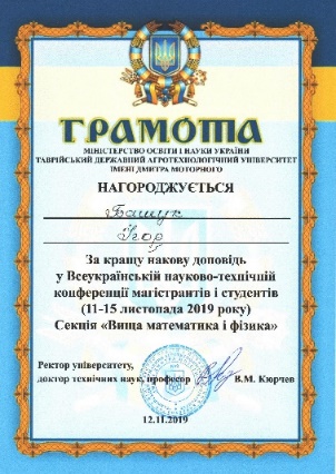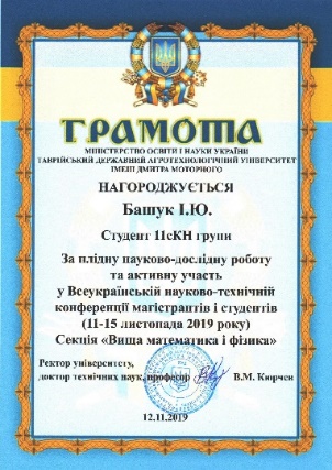 За підсумками роботи науково-технічної конференції магістрантів і студентів ТДАТУ за 2019 рік Башук Ігор отримав грамоту за кращу наукову доповідь.