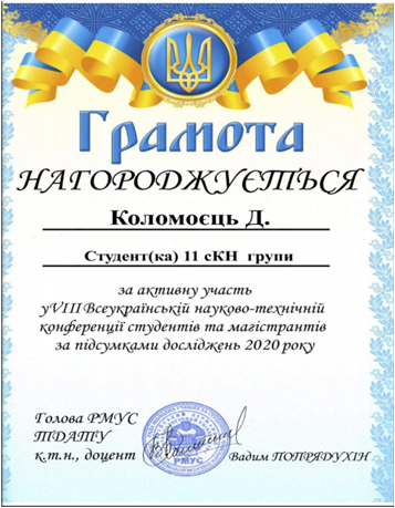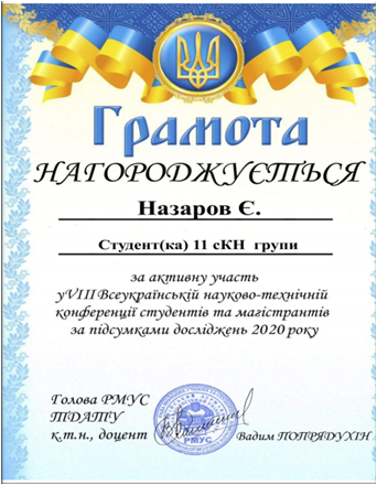 Є. Назаров та Д. Коломоєць отримали подяку за кращу презентацію доповіді на тему: „3D – моделювання інтерференційної схеми одержання кілець Ньютона у програмі Blender”, прийнявши уасть у VIII Всеукраїнській науково-технічній конференції студентів та магістрів від секції “КОМП’ЮТЕРНІ НАУКИ”.