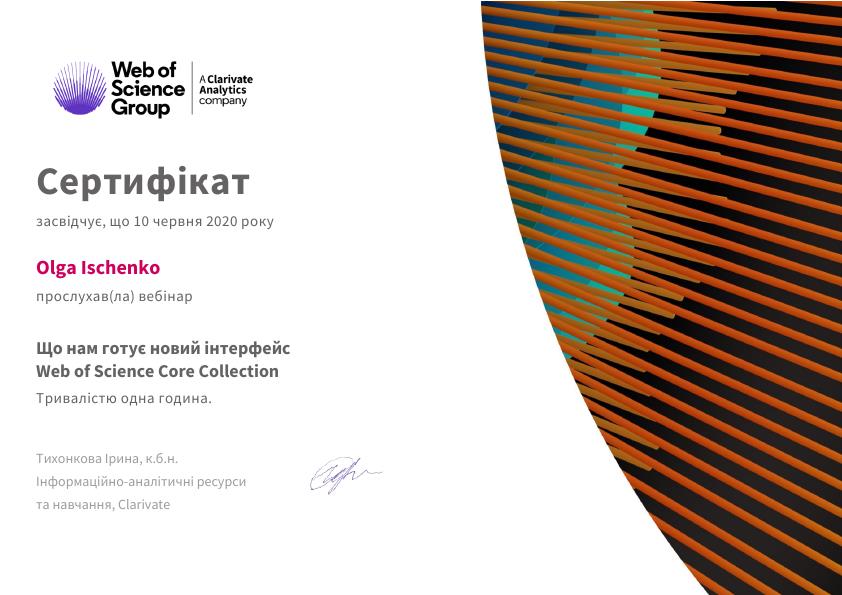 2 і 10 червня викладачі кафедри вищої математики і фізики прийняли участь у вебінарі за темою: Що нам готує новий інтерфейс Web of Science Core Collection. Вебінар організувала компанія Clarivate Analytics. Лектором була експертка з інформаційно-аналітичних ресурсів та навчання компанії Ірина Тихонкова. Під час вебінару було розглянуто наступні питання: Платформа Web of Science модернізується та оновлюється. Вже доступний для перегляду новий інтерфейс з базовим пошуком. На вебінарі наживо переглянуто, що буде змінено, що залишиться незмінним, повторено алгоритм пошуку даних, збереження інформації, наявні доступні функції. Порівняно з інтерфейсом, що існує. Зроблено пошук за темою, проаналізовано ким, де в яких країнах виконувалися ці роботи, якими фондами фінансувалися, в яких виданнях друкувалися. Обговорено питання з реєстраційних анкет. За результатами перегляду вебінару було отримано сертифікати учасників.