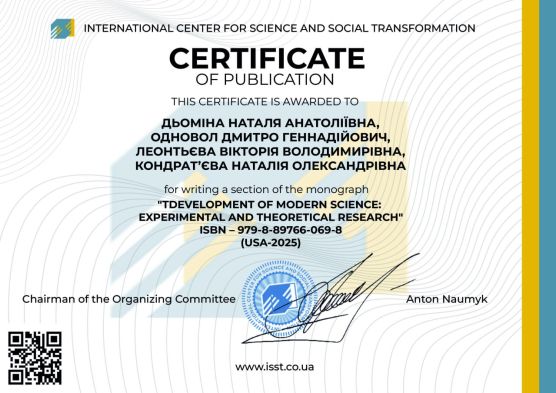У квітні 2025 року викладачі кафедри – завідувачка кафедри Дьоміна Н. А., доцент Леонтьєва В. В. та ст. викладач Одновол Д. Г. взяли участь у роботі групи авторів з метою підготовки колективної монографії на тему: «DEVELOPMENT OF MODERN SCIENCE: EXPERIMENTAL AND THEORETICAL RESEARCH».