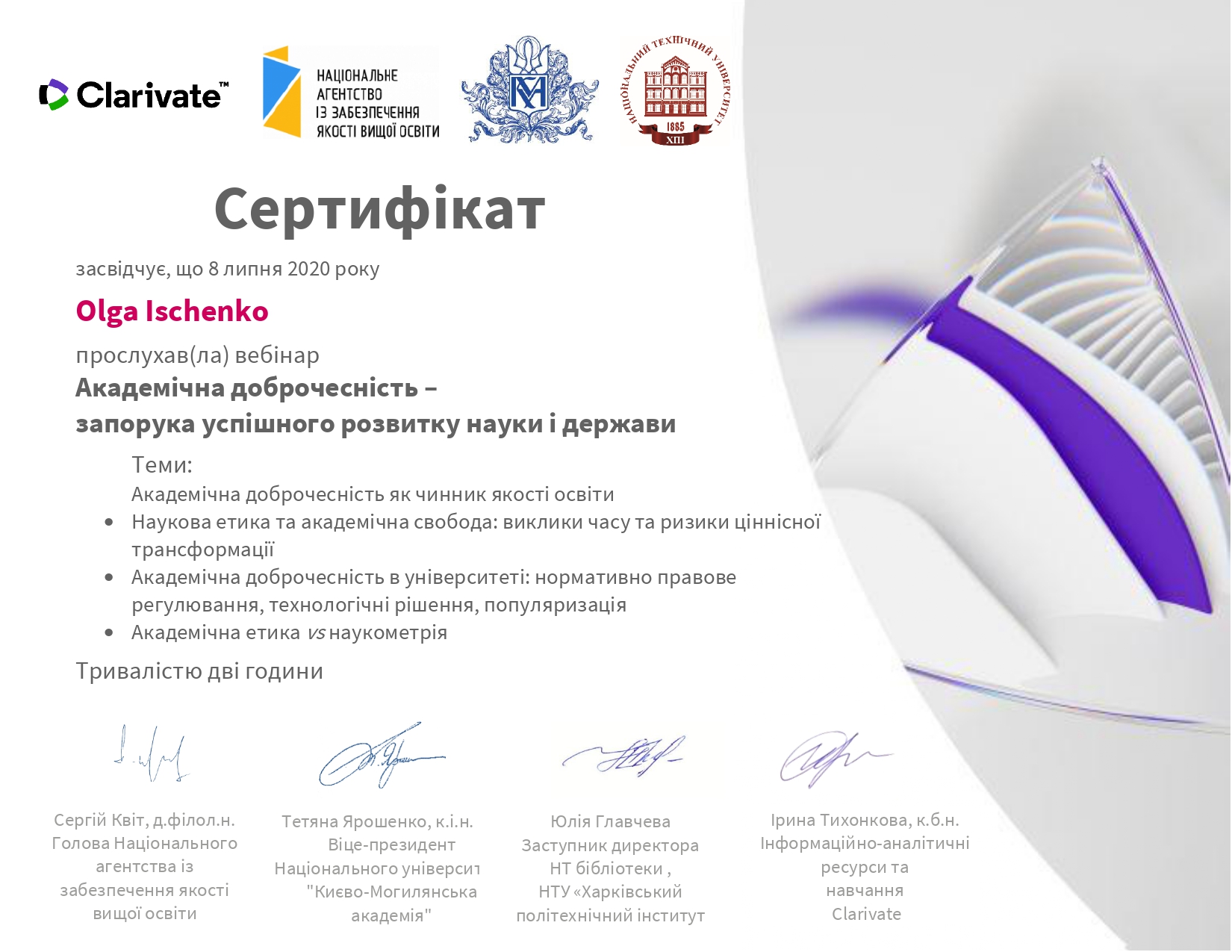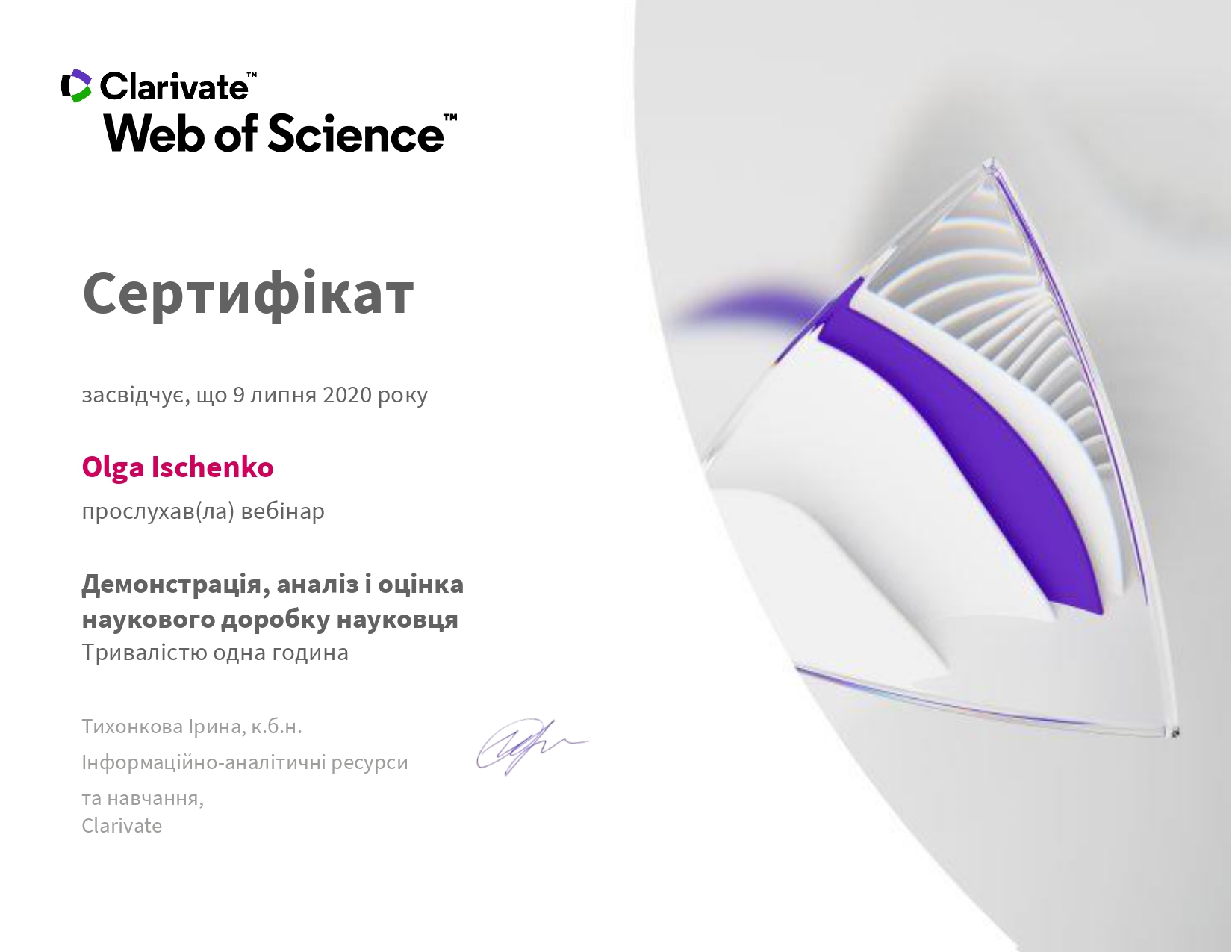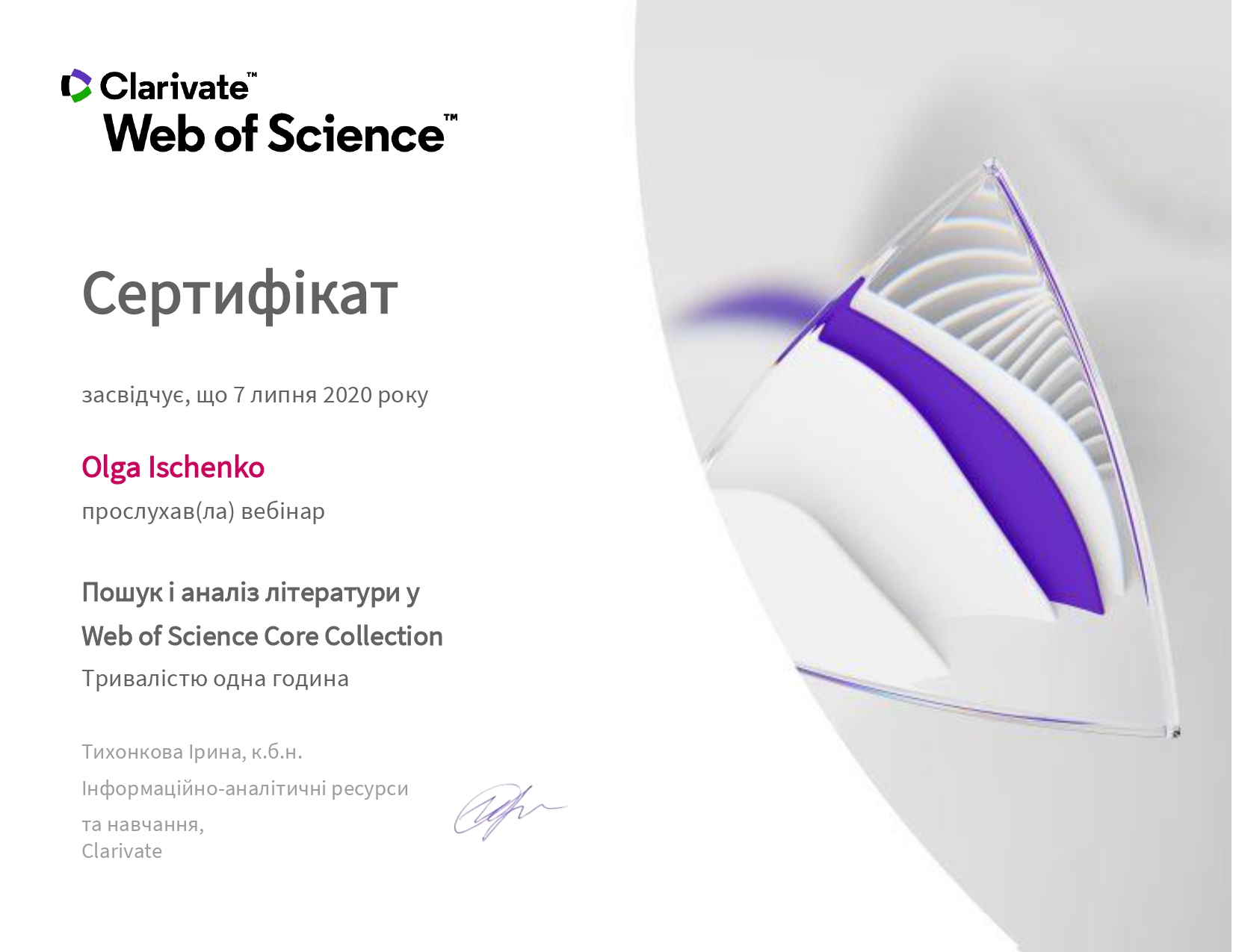 Протягом 7-10 липня 2020 року викладачем кафедри вищої математики і фізики Іщенко О.А. прийнято  участь у вебінарах за темами «Академічна доброчесність – запорука успішного розвитку науки і держави»; «Пошук і аналіз літератури у Web of Science Core Collection»; «Демонстрація, аналіз і оцінка наукового доробку науковця»; «Аналітичний інструмент InCites для установи та науковця».