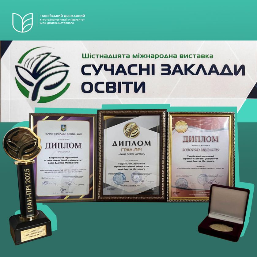 З понад 523 учасників ХVІ Міжнародної виставки «Сучасні заклади освіти — 2025» ТДАТУ було відзначено золотою медаллю в тематичному конкурсі в номінації «Супервізія як інструмент професійного розвитку педагогів», а науковці університету – учасники виставки, були відзначені дипломами, Почесними грамотами та отримали сертифікати. Досягнення високого результату стало можливим завдяки злагодженій роботі дружнього колективу ТДАТУ, який попри повномасштабну війну та постійні обстріли рф прифронтового Запоріжжя, робить все можливе заради розвитку рідного університету.