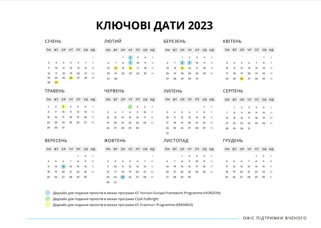 КАЛЕНДАР ПОДАНЬ ГРАНТОВИХ ЗАЯВОК ДЛЯ НАУКОВЦІВ ТА ЗАКЛАДІВ ВИЩОЇ ОСВІТИ_2023