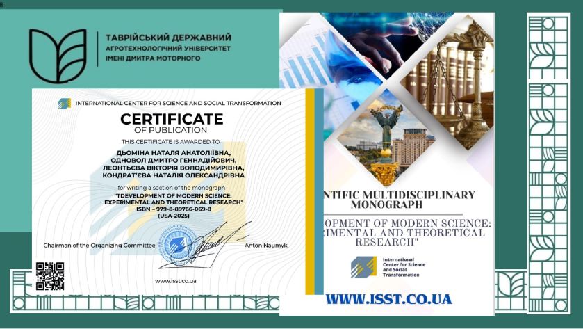 У квітні 2025 року викладачі кафедри вищої математики і фізики ТДАТУ – завідувачка кафедри Наталя Дьоміна, доцент Вікторія Леонтьєва та ст. викладач Дмитро Одновол взяли участь у роботі групи авторів з метою підготовки колективної монографії на тему: «DEVELOPMENT OF MODERN SCIENCE: EXPERIMENTAL AND THEORETICAL RESEARCH».