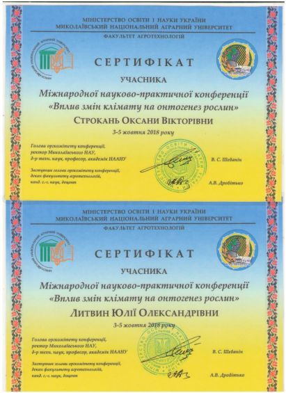 З 3 по 5 жовтня 2018р. у Миколаївському національному аграрному університеті проводилась міжнародна науково-практична конференція “Вплив змін клімату на онтогенез рослин”. Асистент кафедри комп’ютерних наук Литвин Юлія Олександрівна та к.т.н., доцент кафедри КН Строкань відвідали цю конференцію з доповіддю на тему “АВТОМАТИЗОВАНА МЕТЕОСТАНЦІЯ МОНІТОРИНГУ ЗОВНІШНІХ ПОГОДНИХ УМОВ”. Актуальність питання полягає у тому, що спостереження за метеорологічними умовами та їх зміною має велике практичне значення в умовах овочівництва закритого та відкритого ґрунту.