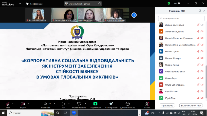 5. Доповідь на тему «Корпоративна соціальна відповідальність як інструмент забезпечення стійкості бізнесу в умовах глобальних викликів» аспірантки кафедри фінансів, банківського бізнесу та оподаткування Національного університету «Полтавська політехніка імені Юрія Кондратюка» Олени Богомаз.