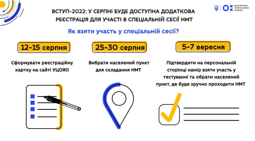 З метою забезпечення права на здобуття вищої освіти осіб, які через військово-політичну ситуацію та наслідки військової агресії рф не змогли зареєструватися для участі у ЗНО (НМТ) в основний і додатковий періоди, отримають можливість зробити це під час спеціального періоду.