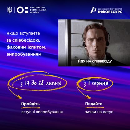 Розпочинаєте зі створення електронного кабінету — з 1 липня. Також з першого липня стартує реєстрація на вступні випробування – якщо вступаєте за співбесідою, фаховим іспитом чи випробуванням (замість ЄВІ та ЄФВВ).