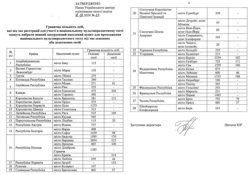 Український центр оцінювання якості освіти затвердив перелік країн та закордонних населених пунктів, в яких у 2024 році буде надана можливість складання Національного мультипредметного тесту наказ УЦОЯО №23 від 12.03.2024 р.