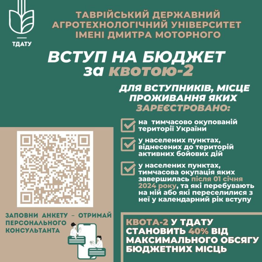Шановний вступнику, якщо ти випускник 11 класу закладу загальної середньої освіти, закладу професійної освіти, фахової передвищої освіти і твоє місце проживання зареєстровано на тимчасово окупованій території, у населених пунктах віднесених до територій активних бойових дій, у населених пунктах, тимчасова окупація яких завершилась після 1 січня 2024 року, та ти перебуваєш на ній або переселився з неї в календарний рік вступу, ти можешь скористатися спеціальними умовами вступу за державним замовленням і бути зарахованим до ТДАТУ на освітній рівень бакалавра на бюджетні місця у межах КВОТИ-2.