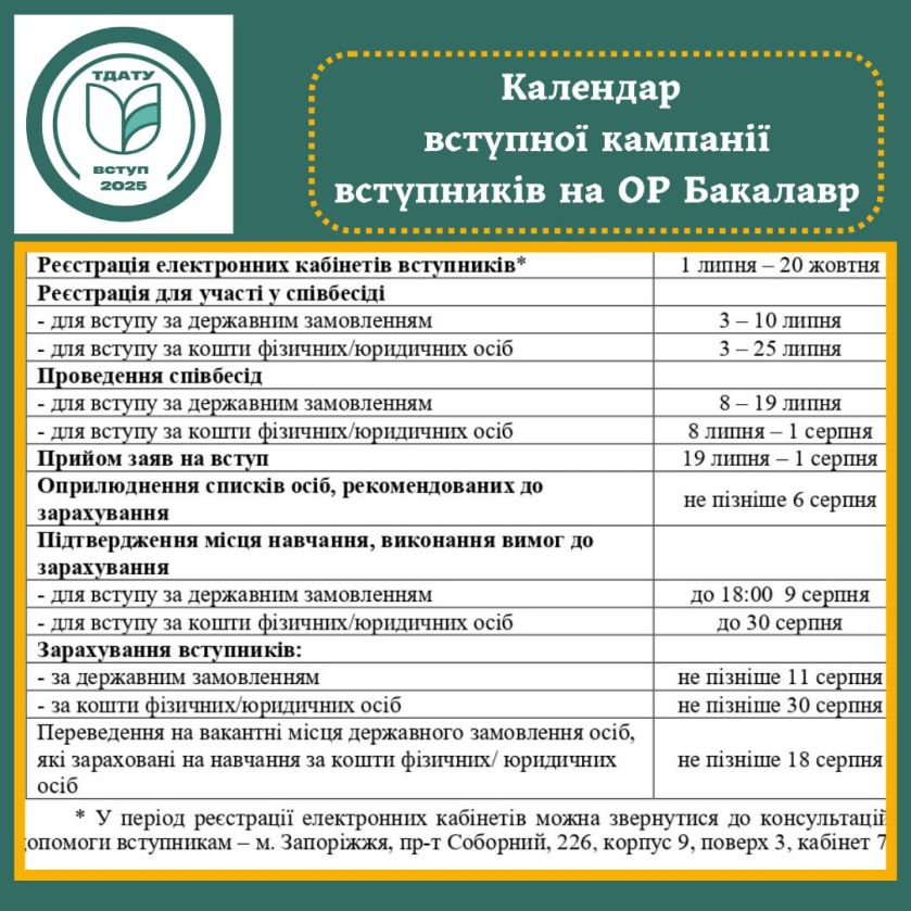 Вступна кампанія 2025 стартувала 1 липня з реєстрації електронних кабінетів вступників та триватиме до 20 жовтня. Наводимо основні дати на бакалаврат.