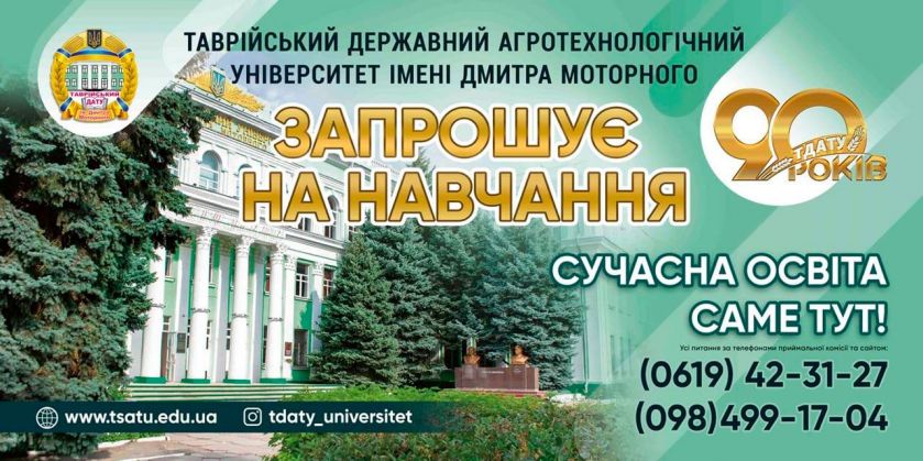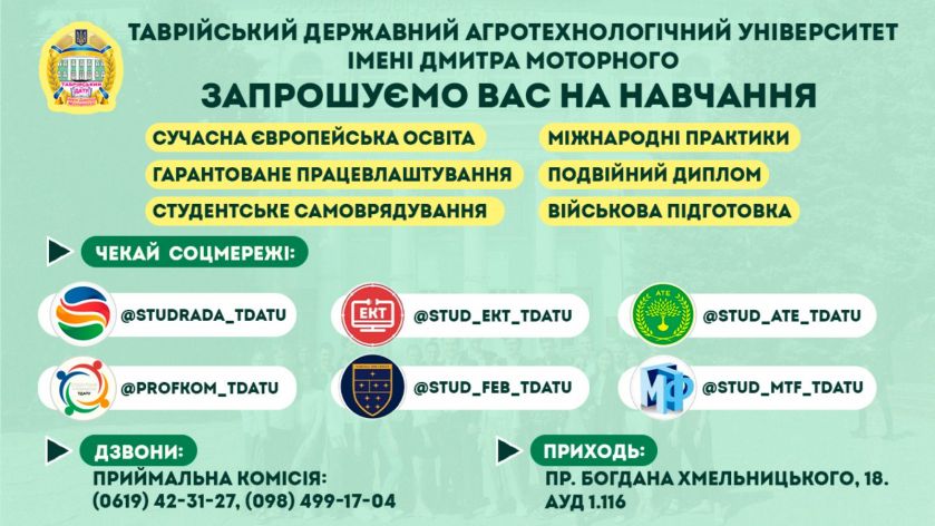 20 перспективних спеціальностей, міжнародні практики, подвійний диплом, гарантоване працевлаштування, цікаве студентське життя, військову підготовку – все це пропонує абітурієнтам лідер сучасної європейської освіти – Таврійський державний агротехнологічний університет імені Дмитра Моторного.