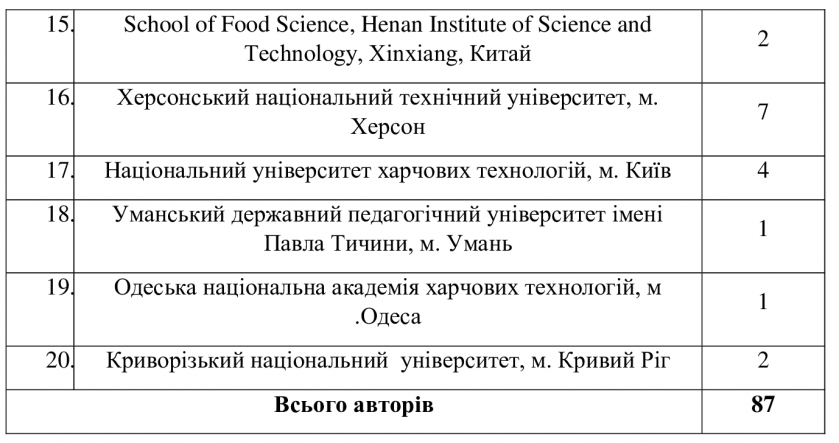 Всього опубліковано 37 статтей 87 авторів з 20 ЗВО України, Китаю та Республіки Білорусь: